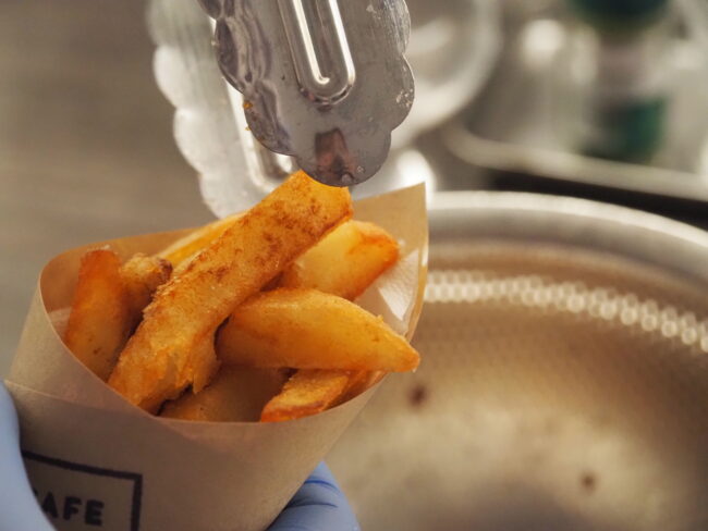 フライドポテトはホッカイコガネという品種のじゃがいもを使っています。この品種は市場に流通することは少なく、主に加工用として栽培されているじゃがいも。 また、新じゃがいものでんぷん質から少し糖化するタイミングを見極めて加工しています。