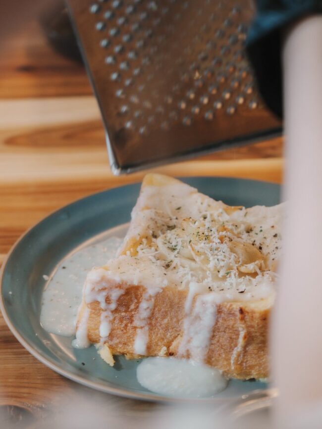 一番人気のメニューは「JAGA CHEESE 1,300円」。芽室町大友牧場のチーズ「ツナグ」を使用しており、芽室町産のじゃがいものポタージュソースとスライスポテトをトッピングした食事系のフレンチトーストです。